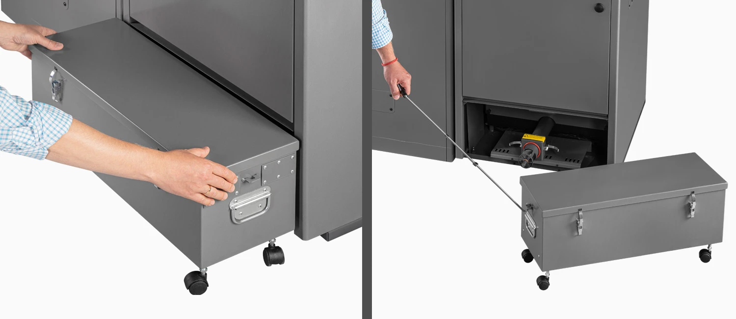 Jeśli chcesz jeszcze rzadziej wybierać popiół z kotła, możesz wyposażyć kocioł z zewnętrzny system odpopielania z kompresją popiołu. To rozwiązanie umożliwia wybieranie popiołu jedynie 2/3 razy w ciągu sezonu grzewczego. Popiół można wywieść do opróżnienia (np. jako nawóz do ogrodu) w bardzo praktyczny sposób.