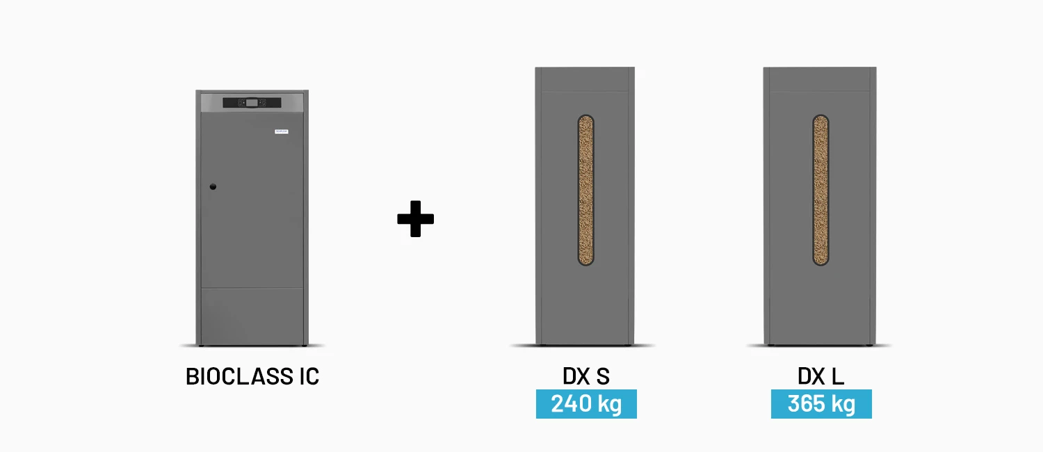 Do wyboru są dwa warianty zbiorniki na pellet: DX S o pojemności 240 kg lub DX L o pojemności 365 kg. Oba zasobniki zapewniają dużą autonomię pracy, dzięki czemu pellet trzeba dosypywać zdecydowanie rzadziej. Dodatkowo mogą być one zamontowane zarówno z lewej, jak i z prawej strony kotła, co zwiększa elastyczność instalacyjną. Połączenie systemu automatycznego czyszczenia z dużą pojemnością zasobnika na pellet sprawia, że użytkownik bardzo rzadko musi zaglądać do kotłowni, ciesząc się wygodą i bezobsługową eksploatacją. Przy zamówieniu należy wybrać model zasobnika DX S lub DX L.